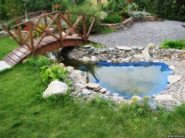 Еще один интересный вариант обустройства искусственного водоема на дачном участке – монтаж декоративных мостиков. Эти конструкции можно приобрести уже готовыми или сделать их своими руками. Мостики могут быть деревянными, каменными или металлическими – сварными или коваными. Достоинство этих элементов заключается в том, что они подходят для декорирования и пластмассовых прудов, и любых других.