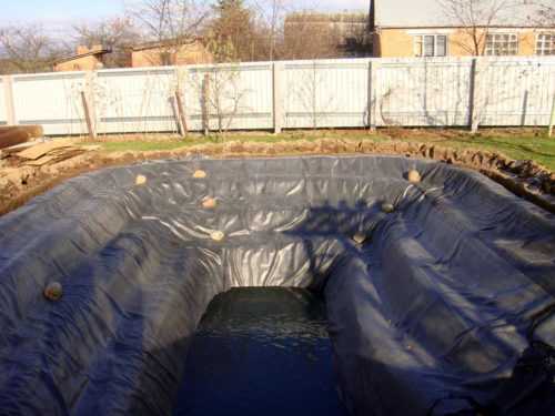 С помощью купленной пленки застелите дно котлована. Первым слоем ниже пленки нужно положить геотекстиль – он послужит защитой для пленки от растений и камней.