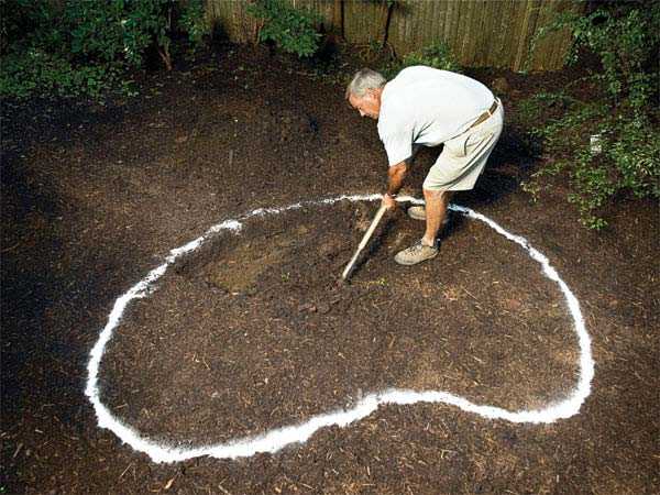 На выбранном месте зафиксируйте границы будущего пруда при помощи веревки и колышков или же уложите ванну на землю и обведите ее контуры.