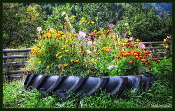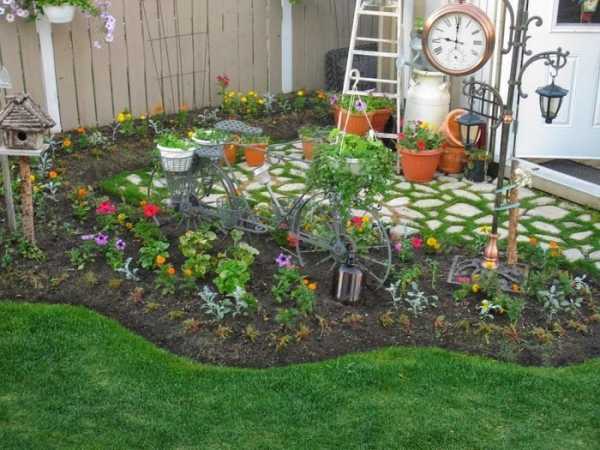 Для того, чтобы придать необычной формы цветнику, можно использовать любые предметы из