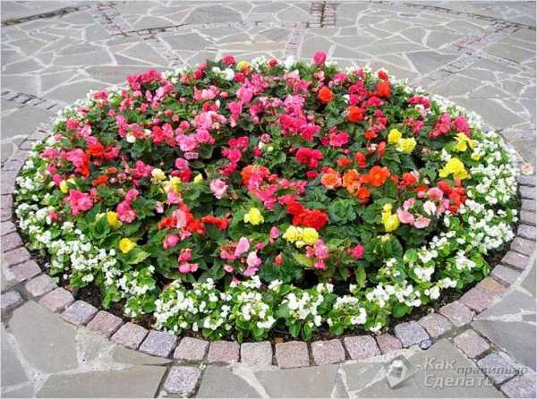 Особый случай — хвойные и небольшие кустарники: чаще всего бывает достаточно и одного экземпляра. Но есть и исключение. Очень интересно можно оформить клумбу из роз или бегоний, сочетая с хвойниками или без них. В первом случае можно выбрать, например, яркие бегонии одного цвета, но разных оттенков, как на фото. Если хвойные растения не предусмотрены, уместны розы или бегонии более спокойных цветов, лучше пастельных оттенков.