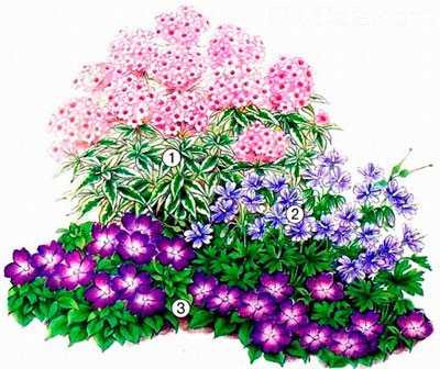 Такую пеструю симпатичную клумбу можно создать, используя всего три растения. 1- флоксы на заднем плане как наиболее высокие, 2 – луговая пеларгония, 3 – бальзамин или анютины глазки