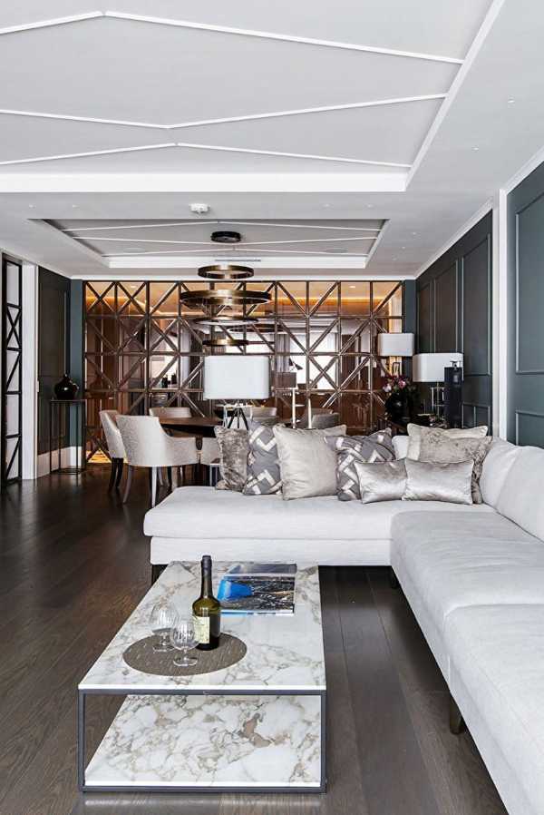 Чтобы отделить дополнительные зоны, которых в гостиной должно быть не более двух, можно использовать сквозные стеллажи, ковровые покрытия, фигурные конструкции потолка или же элементы мягкой мебели.