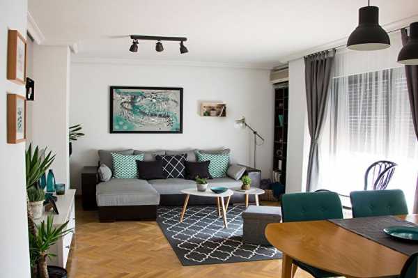 Гостиная должна иметь яркий акцент. Точкой такого фокуса можно сделать зону отдыха, играя на цветовых контрастах или используя сложные тона. В вышеприведённой модели оформления комнаты использовано выигрышное цветовое сочетание графитового цвета с бирюзой.