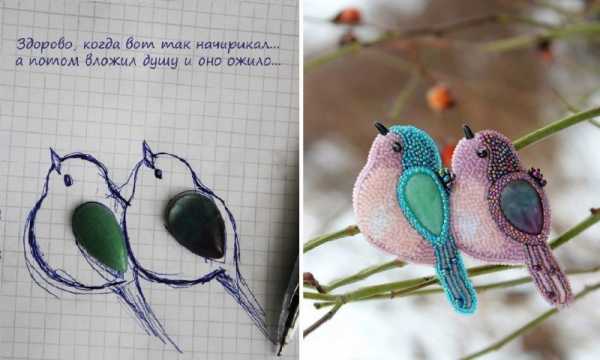 Вот еще — на фото ниже мы видим птичек. Они сделаны как раз в похожей технике. Только сдесь не просто круг пополам – а к фигуре круга добавили изменения. Ниже я специально нарисовала вам чертеж этой птицы – чтобы вы сами увидели как создались такие изменения.