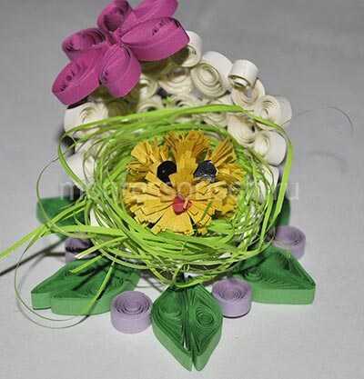 Вы можете своими руками из бумаги сделать целую птичью семью в гнездышке, тоже сделанном из бумажных полосок.