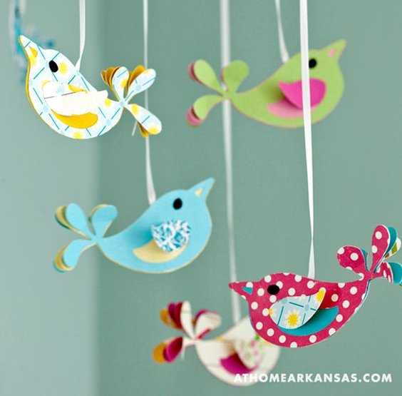 Ваших бумажных птиц вы может повесить на веточку весеннего дерева. Или сделать мобиле- подвеску для украшения детской комнаты. Разбавить птичек цветочками, листочками, тучками.
