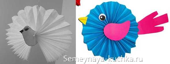 Можно из салфетки сделать веер-гармошку. Сделать прорези в силуэте птицы и вставить веер как крылья и хвост нашей бумажной птички. Простая поделка для детей.