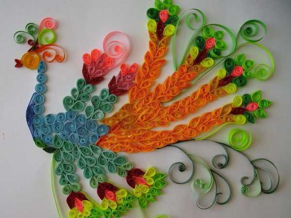 А вот детские поделки птиц, где оперение сделано в технике бумажных петель. Обычная полоска бумаги складывается край к краю на клей – получаем бумажную петельку. Такие петли из бумаги могут стать оперением хвоста павлина.