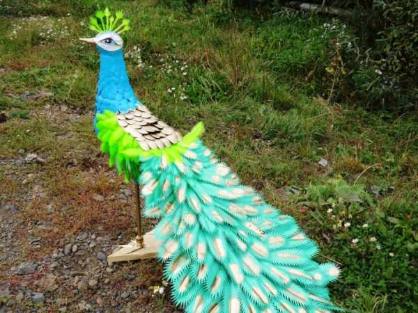 Из пенопласта вырезаем павлина (туловище и голову) и делаем углубления для глаз. Фиксируем металлический пруток в полене и насаживаем на него павлина. Аккуратно вырезаем разного размера «перья» из разноцветных бутылок.