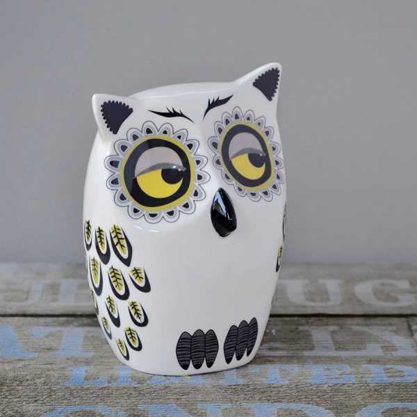 Вырежьте клюв-треугольник и наклейте на соответствующее место. Из черных и белых кругов соберите глаза совы и приклейте к цилиндру. Сова готова!