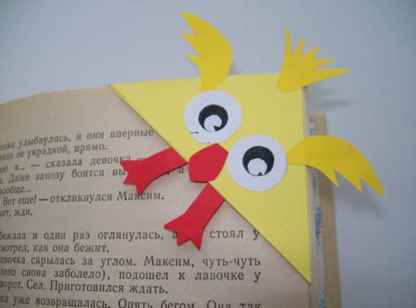 На другой край приклейте треугольник – это будет клюв птички. С внешней стороны наклейте крылья все из той же бумаги-закладки. Внутри прикрепите зубочистку или палочку и воткните ее в кусок пластилина. Можно нарисовать птице глазки.