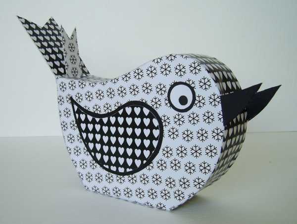 А вот еще одна поделка — фигурная птица из картона или плотной бумаги. Здесь птица тоже сделана из КРУГЛОГО КУСКА картона, который точно так же согнули пополам в полудиск – но потом поработали ножницами, чтобы придать картонному полудиску форму птички.