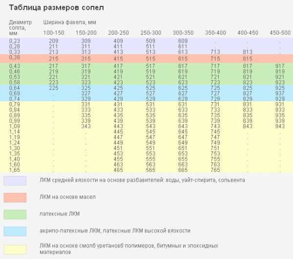 Диаметр сопла (дюзы) выбирают, исходя из структуры распыляемого материала. Чем крупнее частицы краски, тем большее отверстие нужно для их выхода из инструмента. Оптимальные показатели диаметра сопла для различных лакокрасочных материалов: