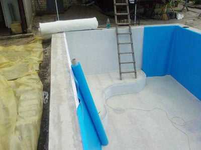 Перед тем, как начать работы по укладке, вам необходимо привести бассейн в порядок и тщательно очистить поверхность чащи от возможного мусора. На подготовленную и оштукатуренную поверхность наклеивается специальная геотекстильная подложка. Она значительно понижает трение пленки о чащу бассейна, в нашем случае бетон, и таким образом повышает сроки эксплуатации.