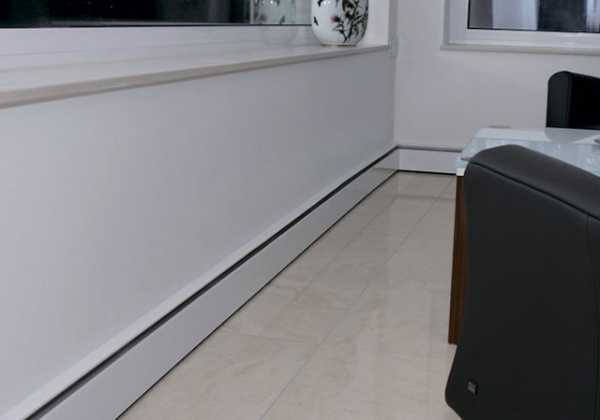 - Плинтусные. Довольно гармонично вписываются в интерьер и практически не заметны. Размещаются вместо плинтуса, создает заслонку теплого воздуха и не допускает попадание холодного в помещение;