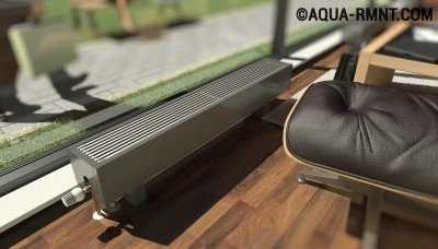 - Внутрипольные. Данный вид конвекторных батарей считается самым современным новшеством и является отличной декоративной деталью, монтированной в пол. Отлично обогревают, отсекают холодный воздух, а также снимают запотевание с окон;