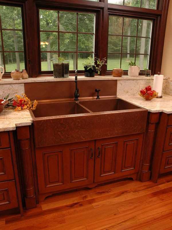 Стиль. Очевидно, что мойка не должна выбиваться из общего стиля кухни. Так, классическая модель из меди явно войдет в противоречие с гладкими лакированными фасадами и «утопленными» ручками из нержавейки.