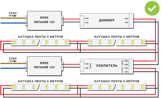 Мощность источника питания ÷ Мощность светодиодной ленты = Общее количество метров, которые вы можете использовать от этой ленты