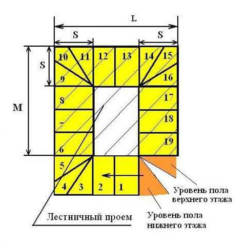 Если места мало, и размеры лестницы необходимо уменьшить, можно площадки между маршами заменить забежными ступенями. Но делать это следует, в крайнем случае, так как такая лестница будет не совсем удобна в использовании. Забежными являются 3-я, 4-я и 5-я ступень, заменяющие собой первую площадку, 9-я, 10-я и 11-я ступени вместо второй площадки и 14-я, 15-я, 16-я вместо третьей (рисунок 6). Для лестницы понадобится участок размером 290*260 см, а размеры лестничного проема – 190*280 см.