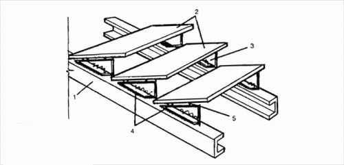 Конструкция простой лестницы: 1 — швеллер; 2 — рифленые металлические ступени; 3 — стальные “кобылки”; 4 — места сварки; 5 — кронштейны крепления ступеней.