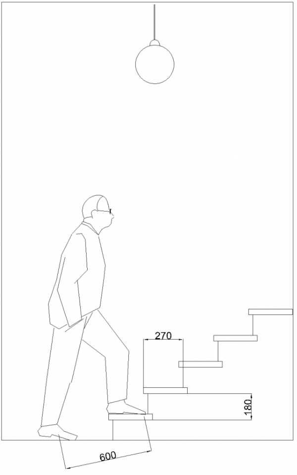 При подъеме человек затрачивает примерно в два раза больше энергии, чем при движении по горизонтали (рис. 2). Практикой установлено: лестница удобна и безопасна, если удвоенная высота подступёнка, сложенная с шириной ступени (проступью), равняется среднему шагу человека. Длина шага человека на плоскости составляет примерно 600–640 мм. Исходя из этого, проступь и подъем определяют по формуле: 2а+b = 600…640 мм.
