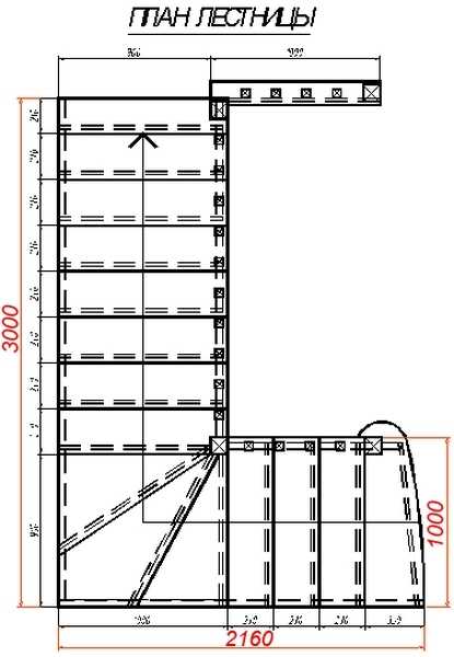 Зная ширину проступи лестницы (300 мм) и количество ступеней (10), можно определить горизонтальную проекцию марша, его длину (заложение марша). Для этого ширину проступи умножают на количество ступеней: