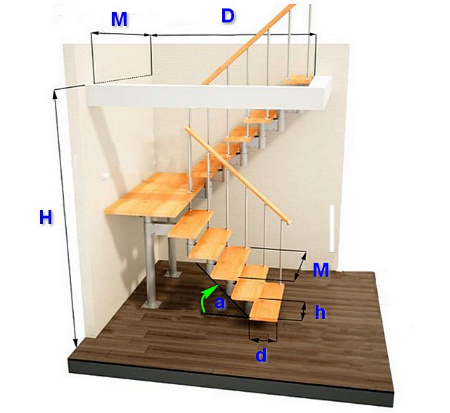 Поворотная конструкция состоит из двух маршей или прямых участков со ступенями, расположенными под углом в 90 градусов. Они объединяются специальной площадкой или имеют плавный забежный разворот. При расчете системы нужны следующие параметры: