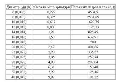 Произведя расчет количества арматуры в погонных метрах, мы можем рассчитать её вес и узнать стоимость. Для этого нам понадобится таблица зависимости веса одного погонного метра арматуры от её диаметра. Формула для расчетов: (количество арматуры в погонных метрах)*(вес одного погонного метра арматуры для соответствующего диаметра)*(стоимость одной тонны арматуры)/1000.