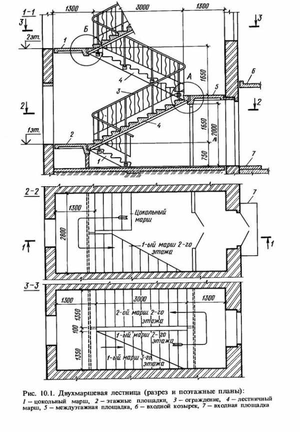 Лестница состоит из маршей и площадок и называется по количеству маршей в пределах этажа. Наиболее распространены в зданиях с высотой этажа до 3 м двухмаршевые лестницы.