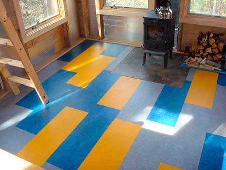 - Синий и голубой линолеум желательно использовать в комнатах, расположенных с солнечной стороны. Они сделают интерьер более свежим и сдержанным;