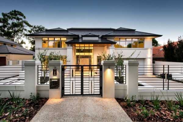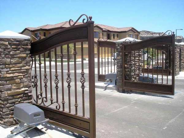 Распашные системы получили свое название за способ открывания – распахивание. Сторонами рам, которые соединяются при закрытии, они прочерчивают дуги, поворачиваясь на 90 градусов, открывая проезд. Это классическая конструкция, самая простая в самостоятельном изготовлении. Отлично смотрится фото, демонстрирующее украшения ограды, особенно декоративные кованые ворота.