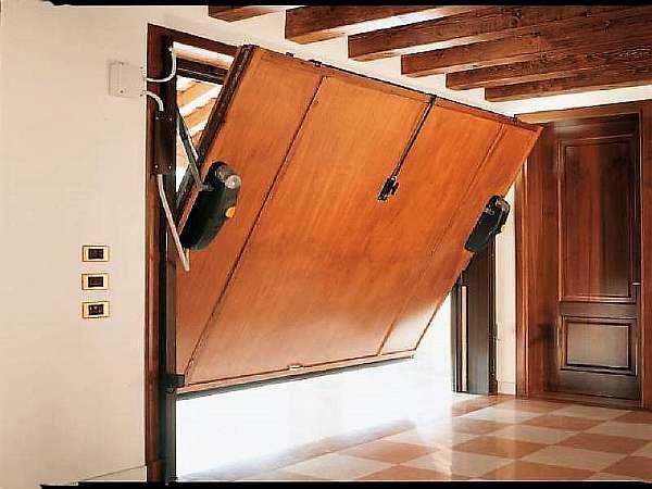 Подъемно-поворотный механизм поднимает полотнище, вращая его вокруг горизонтальной оси. Дверь в таких случаях делается обязательно. Исключением может быть только вариант с входом через дом во встроенном гараже.