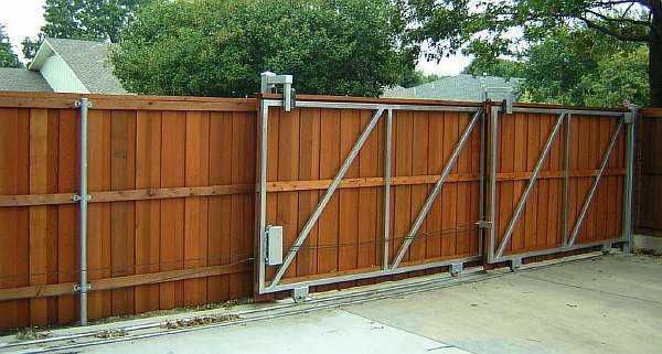 Сдвижные системы могут быть двухстворчатыми, когда половинки открываются синхронно или независимо друг от друга. Калитка – распашная. Она вставляется в полотно на навесах и крепится к собственной раме, встроенной в конструкцию основного каркаса.
