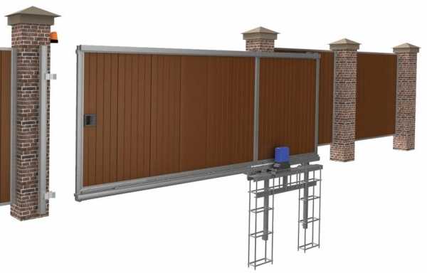 Подвесные ролики движутся по консоли, закрепленной на заборе по центру или в верхней части полотна. Для прочности внизу может устанавливаться дополнительный опорный ролик.