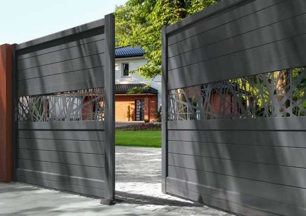 Необычные распашные ворота и калитка с растительными мотивами в дизайне
