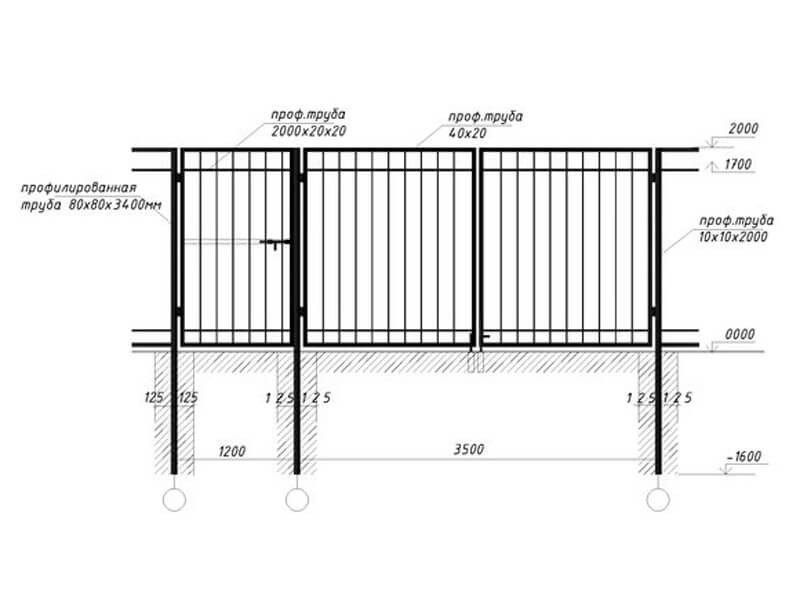 Рассматривая чертёж стандартных ворот из профлиста, можно понять, что в основе такого заграждения лежит каркас из квадратного металлического профиля или толстостенной трубы с 30 мм диаметром.