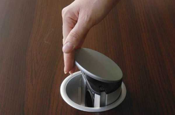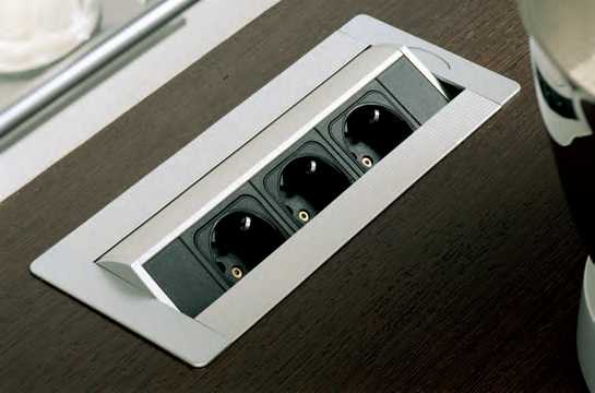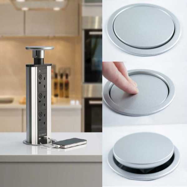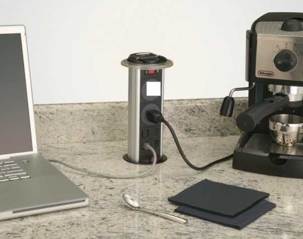 Выдвигающиеся розетки. Они монтируются прямо в рабочую столешницу, как капсула, в навесной шкаф, как перископ, либо в боковую панель. Помимо розеток в них могут быть гнезда для телефона или интернета.