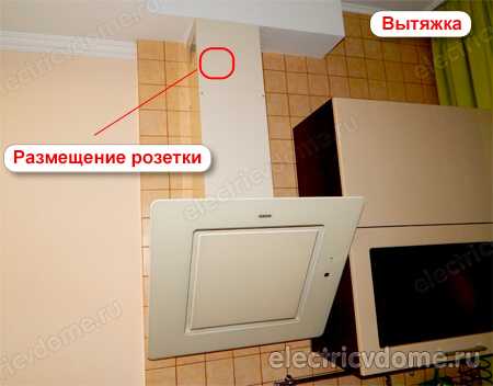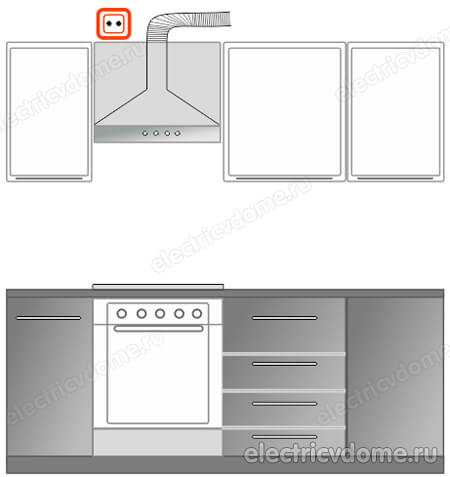 Верхняя секция. Высота розетки на кухне для вытяжки – 5-10 см от верха настенных шкафов или 2,40-2,50 м от пола.