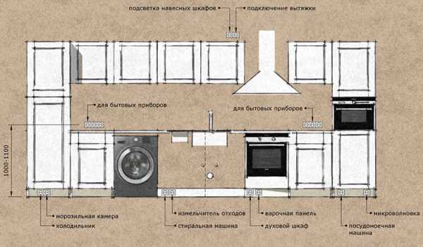 Помощь в точном определении точек подключения приборов окажет схематичный рисунок стен, у которых устанавливается кухонный гарнитур. Нужно отобразить на нем:
