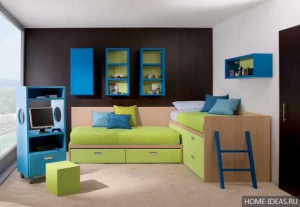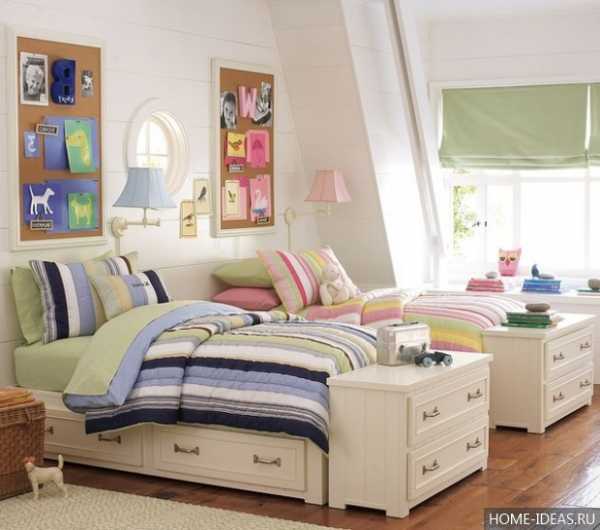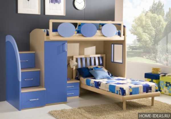 Если детская комната имеет небольшие размеры, можно место хранения совместить со спальной зоной. Сегодня производители выпускают огромное количество интересных вариантов кроватей с потайными ящичками и полочками.