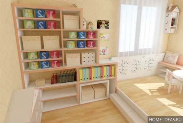 Для хранения в детской лучше использовать невысокие открытые полки вдоль стен, чтобы ребенку было легко дотянуться до них самостоятельно. Лучше не зонировать (не перегораживать) стеллажами небольшую детскую комнату без особой необходимости: стеллаж будет мешаться на пути и создавать опасность.