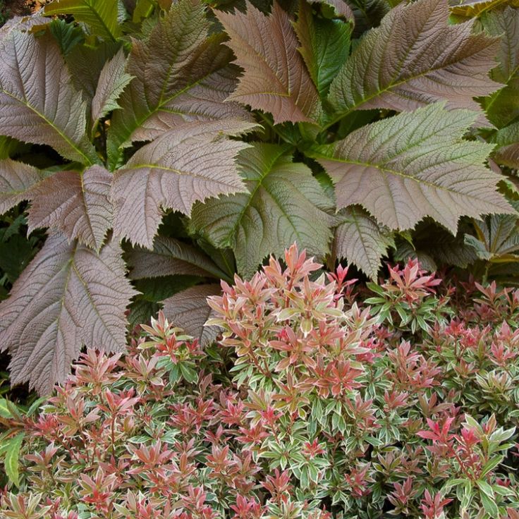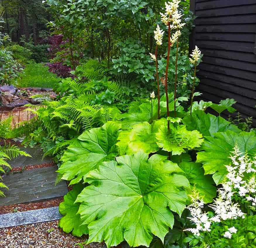 Роджерсии (подофилловая и конскокаштанолистная) – импозантные растения, украшающие любые теневые композиции выразительной фактурой листьев с рельефным жилкованием и огромными соцветиями.