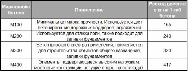 | Маркировка бетона | Применение | Расход цемента в кг на 1 куб бетона |