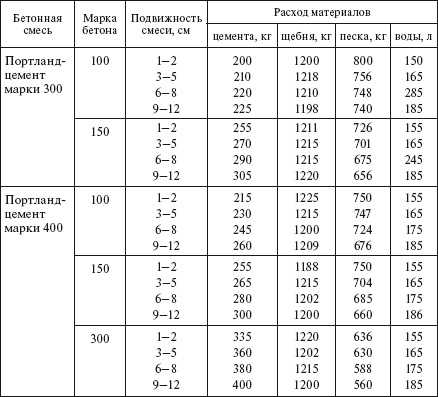 Таблица 1. Пропорциональное содержание цемента, песка и щебня марок 400 и 500 в зависимости от марки бетона