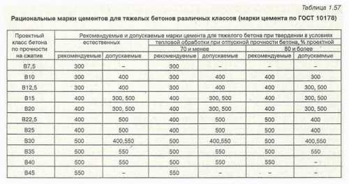 Чаще всего используется вместо 2-х заполнителей (песка и гравия) #8211 ПГС, которая содержит все в той же пропорции, только уже заранее все смешано. Для подбора цемента может использоваться таблица, которая приведена ниже.
