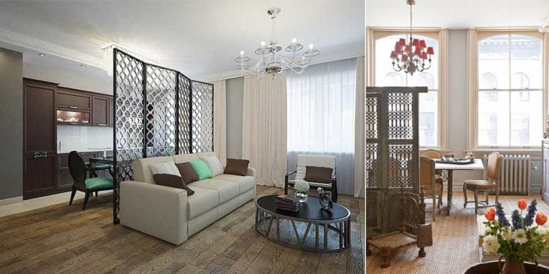 Позволяет использовать любой материал для разделения кухни и гостиной комнаты. Это могут быть шторы, ширма и даже аквариум. Главное, чтобы декоративная конструкция идеально сочеталась с интерьером дома.