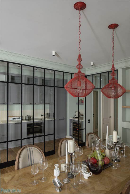 Основная задача как перегородки, так и двери, – гармонично вписываться в дизайн кухни-гостиной, дополнять его и привлекать внимание