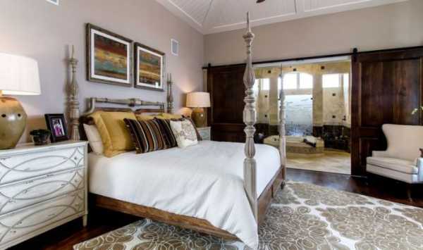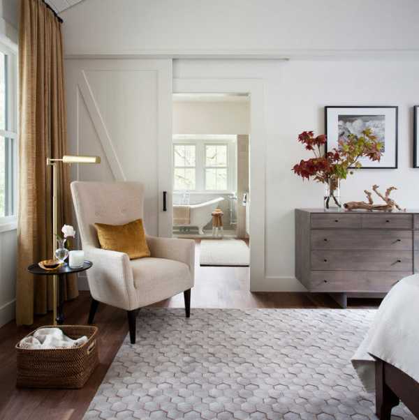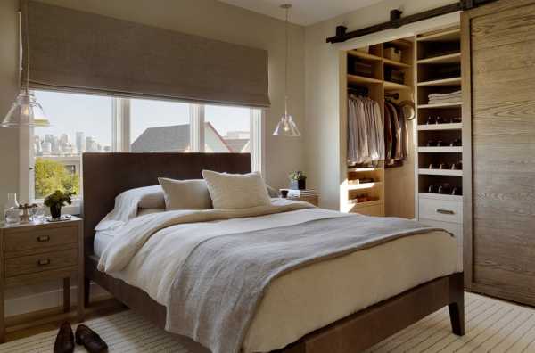 Стильная спальня дополнена просто отличными раздвижными дверьми, которые просто и оптимально вписались в интерьер.