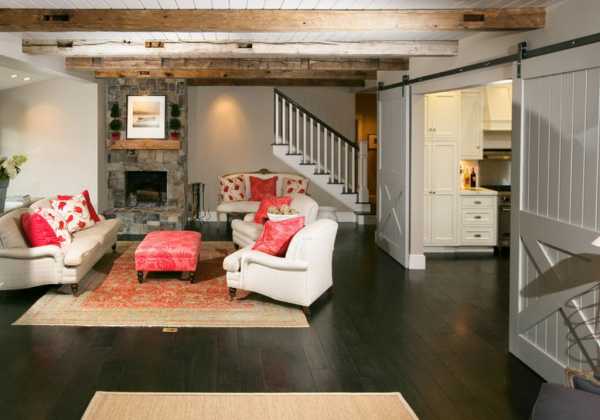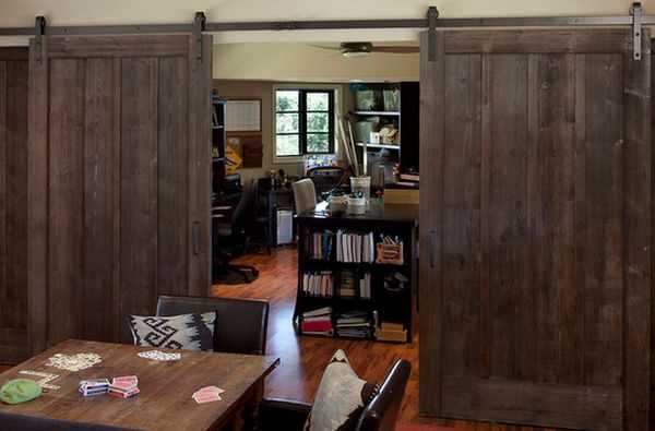 Массивные деревянные конструкции из мелиорированной древесины устанавливают на широкие дверные проемы. Амбарные двери выглядят интересно и стильно, привносят особый характер в оформление.